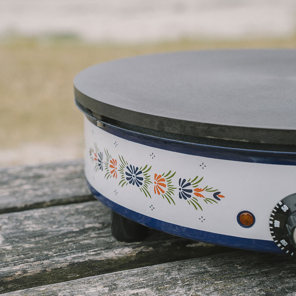 La crêpière électrique Krampouz et Henriot-Quimper est entièrement émaillée à la main et fabriquée en édition numérotée. La faïencerie d’art Henriot-Quimper, célèbre dans le monde entier pour ses bols à oreilles, prête ses motifs traditionnels bretons et la fameuse « touche de Quimper » pour habiller une crêpière d’exception.