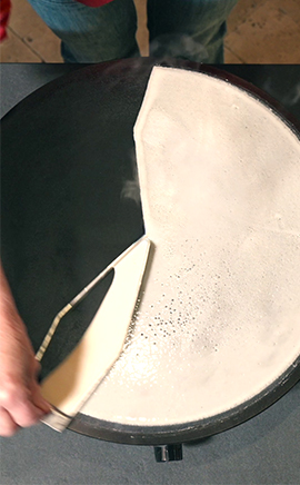 Le premier tour doit être effectué en 2/3 secondes. Continuez doucement la rotation jusqu’à étaler le surplus de pâte restant dans l’étaleur « Easy Crep’ », puis reposez-le dans le bac à eau. Vous pouvez également étaler ce surplus à l’aide du râteau en bois.