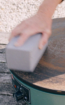 Passer la pierre abrasive sur la plaque en effectuant des mouvements concentriques, sur crêpière éteinte mais plaque encore tiède. Ne pas décaper la plaque à blanc, celle-ci nécessiterait un nouveau culottage. Ensuite, enlever les résidus de pierre abrasive à l’aide d’un chiffon et nettoyer la plaque avec une éponge. Terminer en étalant uniformément 1/2 cuillère à café d’huile sur la plaque. Dans le cadre d’un nettoyage régulier, cette opération permet de limiter l’épaisseur du culottage.