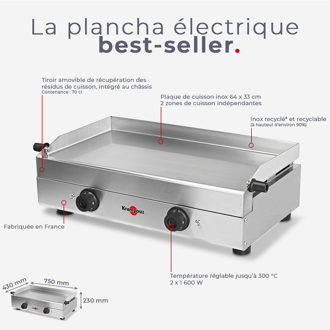 La plancha Saveur électrique double est une plancha avec plaque en inox certifiée contact alimentaire. Équipée de deux zones de cuisson , elle permet de cuisiner pour environ 6 à 8 personnes.
