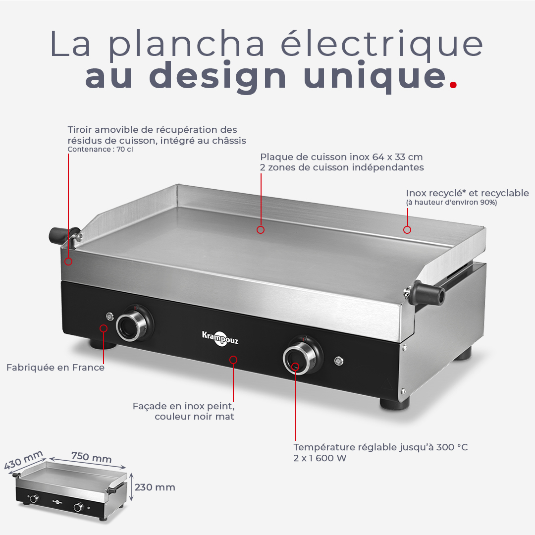 Cette plancha inox électrique offre deux zones de cuisson d’une puissance de 2 x 1 600 W pour une surface de cuisson de 64 x 33 cm.