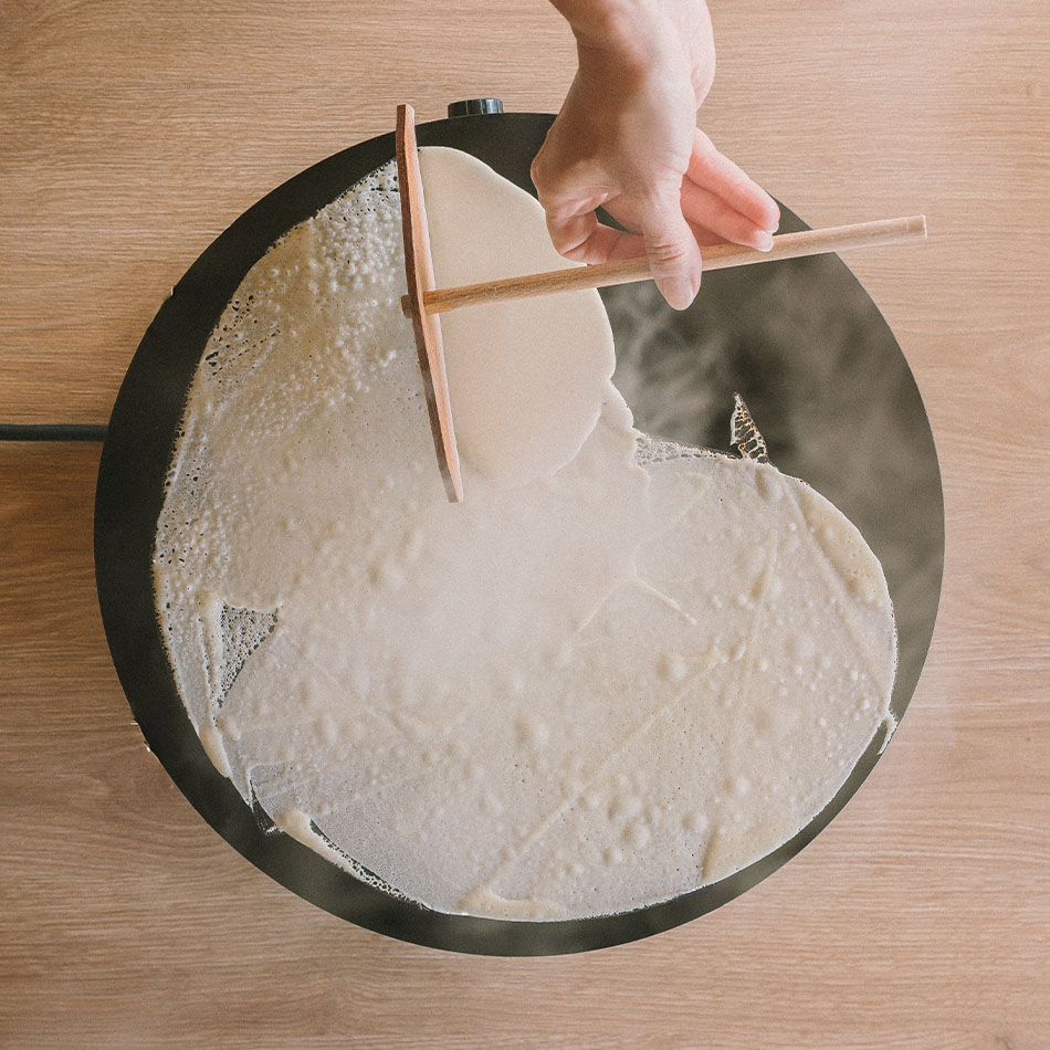 • La technique d’étalement de la pâte à crêpe n’est pas la même selon la forme de râteau choisi : découvrez les bons gestes dans la vidéo à suivre, « les différentes techniques d’étalement de la pâte à crêpes ».