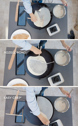 • Le rozell rond : idéal pour débuter, il est plus facile à manier. Avec lui, aucun risque de faire des crêpes trouées. En quelques tours, voilà une belle crêpe régulière mais plus épaisse qu’en utilisant un râteau plat. Avec celui-ci, la pâte est versée au centre de la crêpière et étalée en  faisant pivoter le râteau sur lui-même.