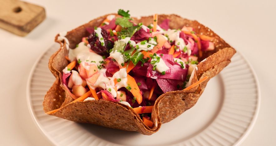 Profitez des légumes d’hiver dans une salade croquante et vitaminée. Le tout relevé par une sauce au fromage de chèvre et servi dans un bol en crêpes de blé noir. Une recette à préparer à la crêpière électrique.